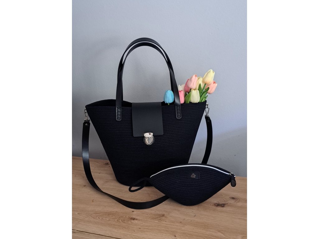 👜 Stylová a praktická kabelka z černých bavlněných šňůr s koženou klopou je ideálním doplňkem pro každodenní nošení..